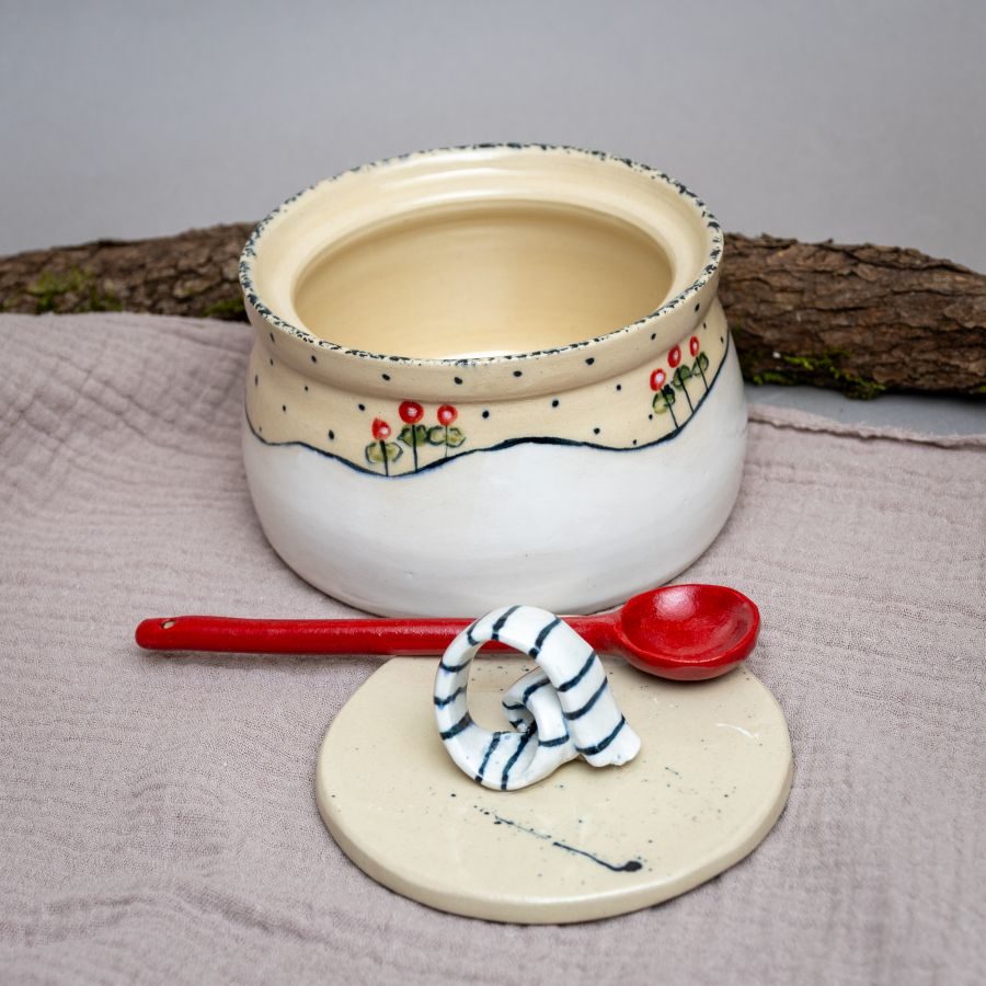 Sladkornica z motivom zimskih rož z žličko. Lahko se uporabi tudi za nariban parmezan.
