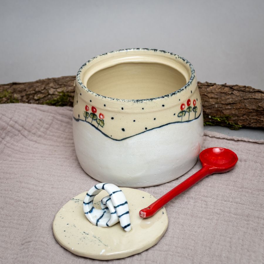 Sladkornica z motivom zimskih rož z žličko. Lahko se uporabi tudi za nariban parmezan.